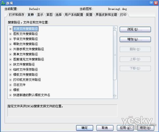 2)在“文件”标签页中,我们可以设置中望CAD的各种文件和内部文件的搜索路径和保存路径。当你觉得在系统默认的目录并不适合你,在这里,你可以把它改成你设定的子目录。