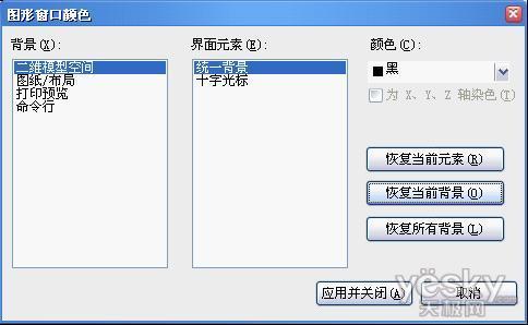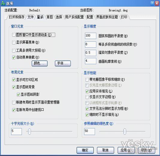 3)在“显示”标签页中,我们可以修改绘图区的屏幕背景颜色、十字光标的显示大小和颜色、图形的显示精度和显示性能等。