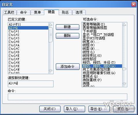 首先,我们先点击新建按钮,然后再按下需要设置的快捷键。比如:按下 ALT+Q 。填下快捷键以后,鼠标点击右边的“可选命令”,选择一个需要的常用命令,比如:相切、相切、相切(A);然后点“添加命令”的按钮。这样一个三切圆的快 捷命令就设置完成;最后点击关闭设置就被保存下来了。这样以后画三切圆直接使用ALT+Q就可以了。同样快捷键定制可以应用在更多的常用命令中,这样我们 的效率就可以大大的提高了。