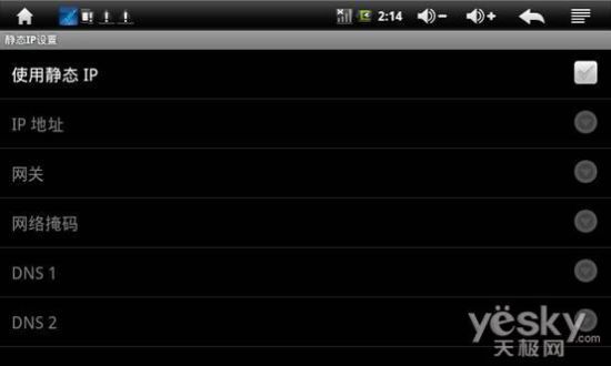 进入静态IP界面后,我们只要对IP地址、网管、网络掩码和DNS1和DNS2输入相关的参数,然后保存,便可以上网了。