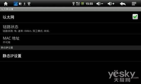 在这里把以太网里的小方框打勾,之后链路状态和MAC地址下方都会出现相关字样,如果屏幕上出现“配置以太网接口成功”,屏幕上方会出现网络连接的图标,此图标就是蓝牙图标旁边那个,畅游网络就此开始。