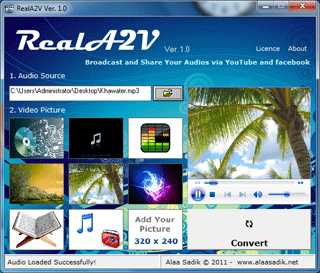 一般的视频网站,包括Youtube、Facebook 以及国内的Youku、Tudou 等都是无法上传MP3 文件的,你需要将音频转换为视频才可以。RealA2V可以让你轻松的将采访、讲座、教室或收音机的音频记录(MP3 文件)转换为视频文件(AVI 文件),这样就能轻松的上传到视频网站了,还可以添加一张封面给视频。