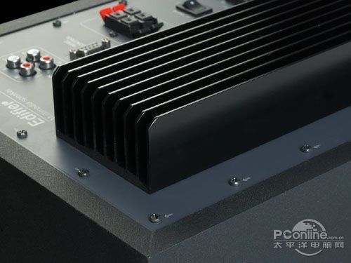 主体框架部分采用黑色塑料制造,这框架被分做两个部分,接合处使用铝合金金属板连接,有利于散热。黑色塑料框架隐约透明,通电后可以看到藏在面板下的各种指示灯,这样使得面板看上去更简洁,这种设计思路之前被引入到Edifier E2100/2200的电源指示灯的设计上,好评如潮。