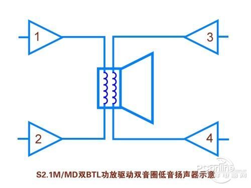 漫步者独具匠心为这个不平凡的双音圈扬声器配置了不平凡的双BTL功放。BTL意思为桥接式放大,它需要2组单声道功率放大芯片配合使用。可以让负载上的最大输出电压倍增,理论上可以让最大输出功率变成一般放大器的四倍。TDA7379具有4声道输出,相当于4颗单声道放大芯片。漫步者将4声道分成2组,每一组构成一套BTL,4声道能构成双BTL,两路BTL分别对应低音扬声器的双音圈,这种设计将低音电路的输出功率提高了8倍,这种设计相当少见。