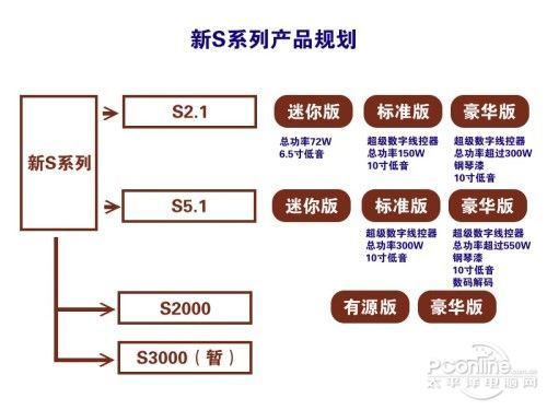 NEW S系列将有2.0、2.1、5.1等多款,每款又将分为迷你版、标准版以及豪华版,集成解码器的以D作为后缀。在功率上、外形上、功能上,这几个版本将有十分大的差异,在NEW S系列中,有口径10寸、总功率高达数百瓦功率的超级堡垒。标准版和豪华版将配备最新的超级数字线控器。NEW S2.1M外形遵从传统、典雅的设计原则,符合音乐高端发烧人群的审美特点。