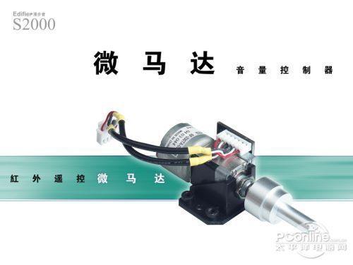 遥控器调控音量在多媒体音箱当中已经不算什么新鲜事情,大部分依赖纯电子解决方案,多年实践证明,纯电子解决方案存在一些小的问题,作为一些中端应用尚可,但已经不适用于S2000。S2000采用高档功放中常见的微控马达,遥控器发出指令,然后由马达旋转电位器达到控制音量的目的,这种应用首次出现在多媒体音箱当中。
