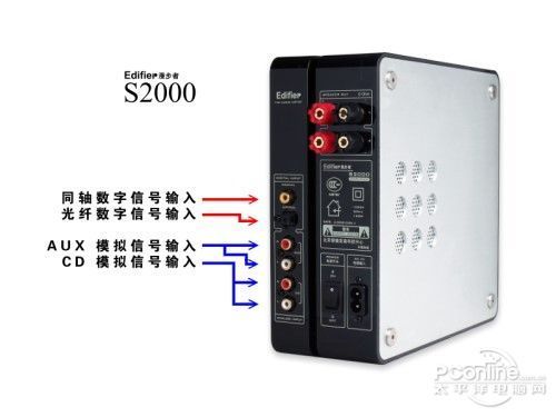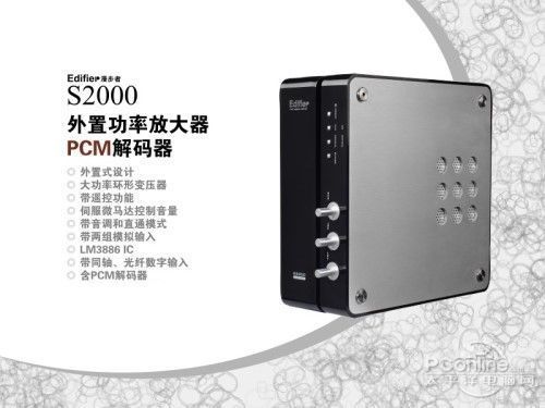 S2000 外置功放中整合高品质PCM D/A解码器,采用Burr-Brown著名的PCM17XX系列DAC芯片,PCM17XX在HiFi音源设备中被广泛采用,主要用于中高档CD唱机设计当中。Edifier会根据市场需求推出采用不同DAC的S2000。
