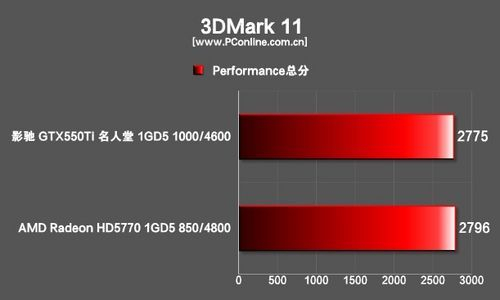 3Dmark11的测试中,影驰GTX 550Ti名人堂略比HD5770低,但两者差距不大,但这点在后面游戏中甚少看到,游戏部分影驰GTX 550Ti名人堂则占据完全优势,相信这也是3Dmark11曾一度被质疑是对AMD显卡优化的原因。>>