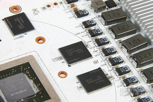 采用非公版8层白巧克力PCB设计,这也是名人堂产品和其他市售型号最明显的区别。该显卡采用和GTX580相同的6+2相分离式供电。用料上则是大量使用坦电容、MLCC、固态电容、贴片电感。