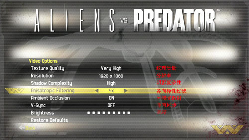 纹理质量、分辨率、阴影复杂性、各向异性过滤、环境光散射,垂直同步的调整菜单。所谓的(环境光散射)Ambient Occlusion是指通过不特定的光源表现周边所有环境阴影的功能。比如在在墙和墙草和草之间相关物体们产生的光线的反射。在测试中我们将所有的特效开至最高。