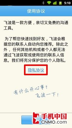 飞波同样是一款国内的社交通讯软件,相比上面的米聊,飞波功能更加丰富,尽管刚刚上线不久,但已经吸引到一批用户。 飞波也是需要手机号才能够进行注册的,让人感觉郁闷的是,在注册之前笔者想阅读以下“隐私协议”但更换了三台手机之后都是无法打开协议,这样的隐私协议岂 不是形同虚设?