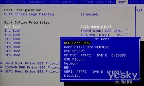 这里设置启动顺序。BIOS自动侦测连接在主板上的启动设备,侦测到的设备会把设备名称型号等显示出来。比如Hard Disk:OCZ-VERTEX2。