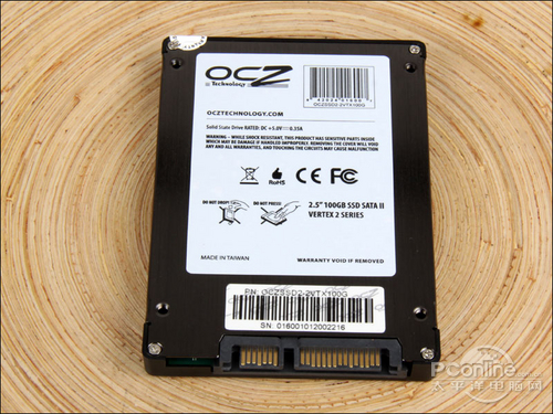 从背面的包装上可以看到,OCZ Vertex 2 SATA II 2.5 SSD 100G固态硬盘的供电需求为5V 0.35A,采用标准SATA II接口设计,同时还通过了CE、FCC以及RoHS环保等多项认证,产地为台湾。