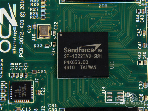 OCZ Vertex 2 SATA II 2.5 SSD 100G固态硬盘采用的SandForce SF-1200主控型号为:SF-1222TA3-SBH,采用364针TFBGA封装,尺寸为13×13毫米,内部集成了一颗Tensilica Diamond Core DC_570T处理器。