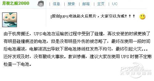 1、机房由于设备起火的案例已经比比皆是了,最近一个网友公司的机房就险些因为UPS造成巨大的损失。下面上图: