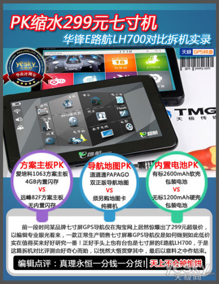 前一段时间某品牌七寸屏GPS导航仪在淘宝网上居然惊爆出了299元超级价,以编辑专业眼光看来,一款正常生产销售七寸屏幕GPS导航仪是如何做到如此低价实在值得买来好好研究一番!正好手头上也有台也是七寸屏的E路航LH700,于是这篇拆机对比评测由好奇心而始,以恍然大悟贯穿其中,最后以意料之中作结束,所谓一分钱一分货,大家在享受超低价299元的同时,恐怕也需要了解一台正常售价GPS导航仪应该是什么样子的,这也就是编辑写这篇文章的原因。