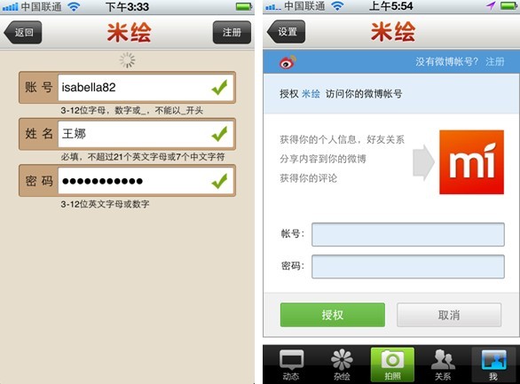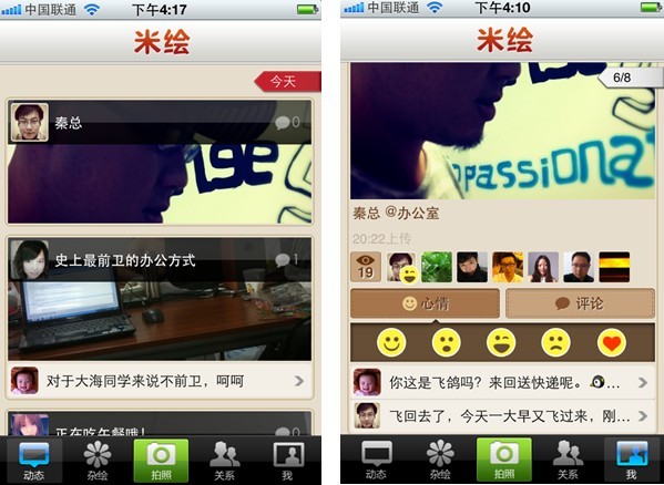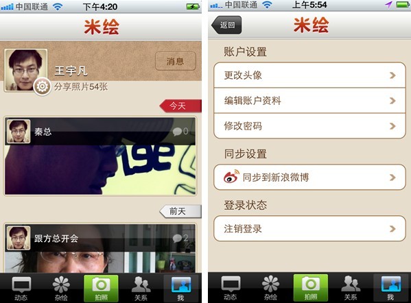 米绘目前支持iPhone手机,很快将推出Android版本,支持用新浪微博账号直接登录、以及将照片同步到新浪微博的功能。
