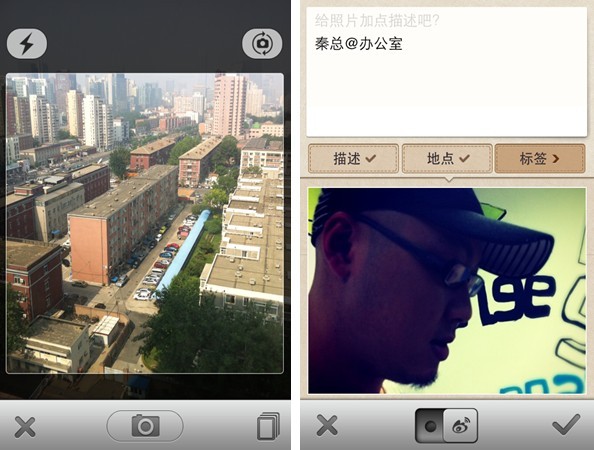 点击下方相机按钮即可拍照。拍照后需要经过简单三步完成分享:“描述、地点和标签”。照片可以选择仅分享给米绘好友,也可以同时分享到新浪微博。