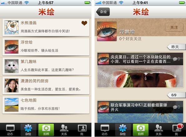 5、米绘还有一个杂绘频道,是以兴趣为导向的拍照分享频道,现阶段主要是关注和浏览,未来支持将照片分享到旅游、美食等各种兴趣频道,也许会吸引到与你志趣相投的好友。