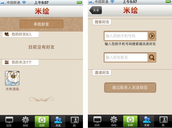 米绘是一个熟人社区,因此和好友在一起分享更有趣。进入关系频道,可以看到顶部的寻找好友按钮。点击顶部的寻找好友按钮,进入寻找好友界面。输 入自己的手机号码,系统就会马上自动寻找已经注册的好友。你也可以输入米绘好友姓名进行搜索,或者直接给通讯录的好友发送短信邀请Ta 加入米绘。