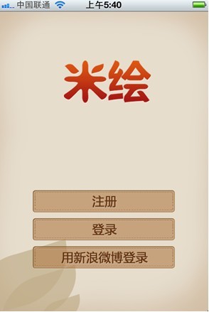打开米绘,首先进入注册登录界面,采用了咖啡底色和皮革按钮的设计,显得比较简洁温馨。新用户可选择用新浪微博登录,也可选择直接注册,如下图所示。