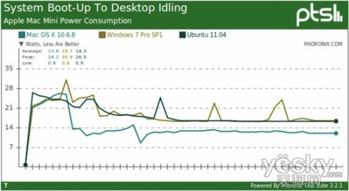 系统启动:Mac OS X首战旗开得胜,平均功耗要比Ubuntu 11.04、Windows 7 SP1少了将近30%。