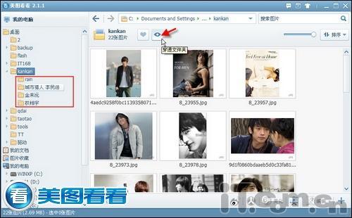必须要承认,韩剧帅哥那是相当多…美男爱好者们电脑里老早就分目录存放了N个韩剧男星的影集,哪天心血来潮调出男星照片慢慢欣赏…但图片都存在 不同文件夹里,切换起来真麻烦。所以我们要用美图看看的“穿透文件夹”功能(如图01),简单一点即可直击所有分类目录底层,将所有图片全部呈现出来,各 色美男放眼而观慢慢选吧!