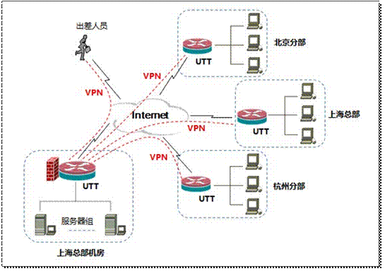 1、 在上海总部机房、上海总部、北京分部、杭州分部各放置一台艾泰科技安全网关/VPN防火墙,通过VPN实现各部与上海总部机房服务器资源的实时访问;