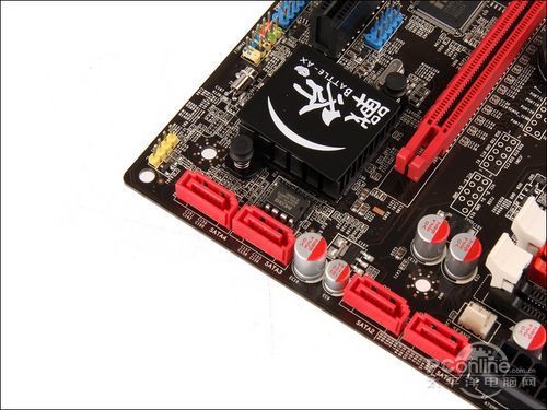 七彩虹 战斧C.H61 V21采用的是扎实的3+1+1相供电设计,其中3相用于CPU核心供电,由uP6230A主控芯片控制,另外2相分别用于集成内存控制器和集成显示核心的供电,用料方面都是1上1下双MOSFET管、抗低温铁素电感和精选的A.S.C固态电容,该用料的地方都用足了料,而且MOSFET部分还带散热鳍片,能为SNB处理器的稳定运行提供充分的保证。