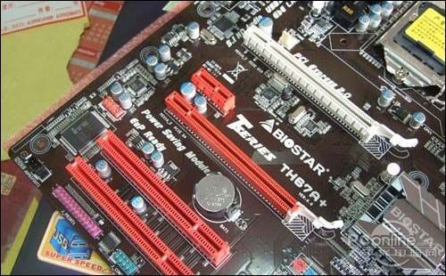 扩展方面,映泰 TH67A+主板提供了2条PCI-E x16 2.0显卡插槽,可以支持X16/X4双卡模式,另外还有1条PCI-E x1插槽,和2条PCI插槽。