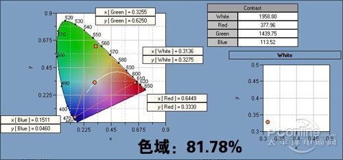 我们在本次评测中使用了PConline评测室的柯尼卡美能达CS-200分光色度计进行客观评测,通过数据指标的方式判断液晶屏幕的优劣。CS-200分光色度计可以测试多种光度指标,包括亮度、色度、色域等,特别是在低亮度的情况下仍然能够保持非常高的精度,能够精确的反映液晶屏幕的性能指标。