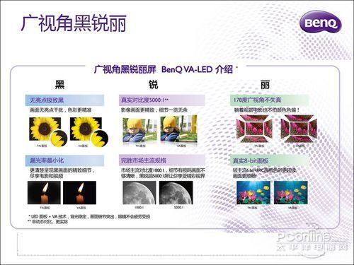 BenQ黑锐丽屏全线产品采用LED背光,同时融入VA广视角面板技术,拥有8-BIT真实色彩,不会呈现色阶不连续现象,画质更细腻,忠实展现极致自然,拥有5000:1真实对比度,使画面对比更加强烈真实,拥有一般TN面板产品难以实现的超广可视角度,然而从不同角度看到屏幕效果并无失真,亮度和色彩的呈现比一般产品有过之而无不及的显示优势。