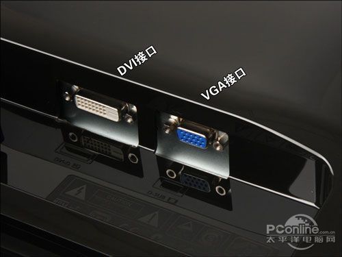 显示器的接口以隐藏式设计在背部下方,支持DVI和VGA两种规格,覆盖市面上大部分PC的输出接口,能满足一般的显示需求。