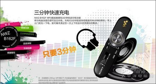 全新索尼 NWZ-B162F(2G)带来索尼对上班族/学生朋友的快速充电解决方案,早上起床发现电池电量不够? 索尼 NWZ-B162F(2G)的3分钟快速充电功能,只需将机器连接USB口充约三分钟,即可聆听约1个半小时音乐,在上班/上学路程中,尽情享受音乐的魅力。让你随时充电随时出发,再也不用为漫长的等待而烦恼了.另外,在完全充电后, 最大提供长达约18小时的使用时间。