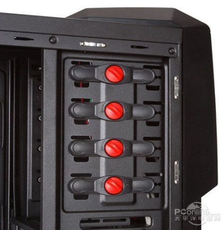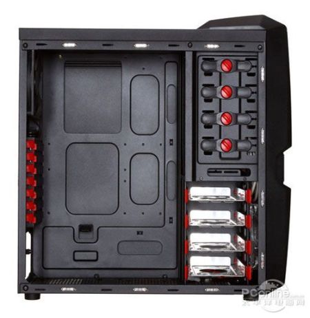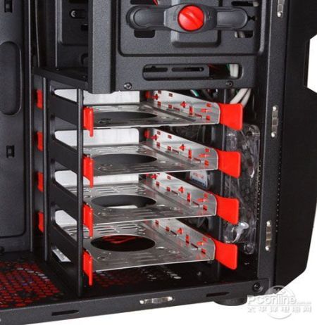 机箱的内部采用了全黑化处理,在PCI扩展位、光驱安装位以及硬盘安装位都可以看到红色的安装工具,比较美观。