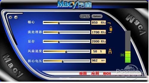 Macy OC ELF是铭鑫的超频软件,在功能上,Macy OC ELF与影驰魔盘接近,除了常用的超频选项外,还提供了BIOS备份和刷写功能,但没有提供显卡各部件的实时后台监测窗口。该软件为了方便用户,每个按键均采用了中英文菜单对比。当用户把鼠标移动到某个按键上时,菜单会自动在中英文间自行切换,满足不同用户的语言使用习惯。