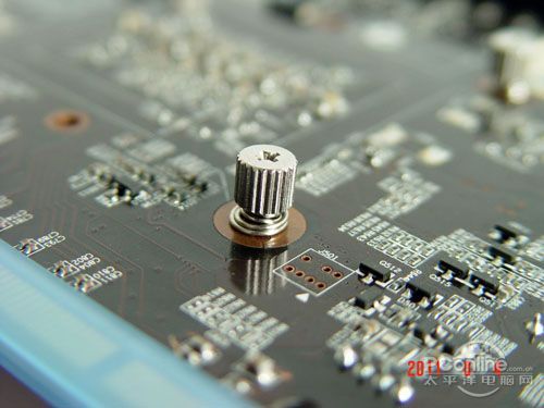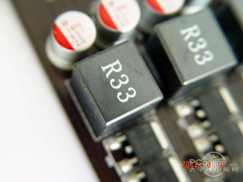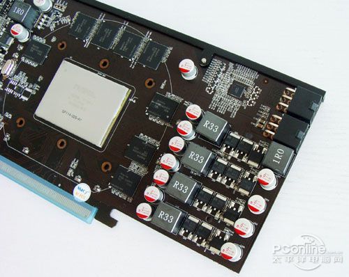GPU供电区域采用的加固POS-CAP贴片式电容,它是日本三洋(SANYO)公司的一种全新的电容产品,它的中文全名是“聚合物有机半导体固态电解电容器”成本高达1美元/颗,常见于高端显卡,具有高安全性、低ESR和低阻抗、卓越的温度特性,并且,在105摄氏度时可以达2000个小时!