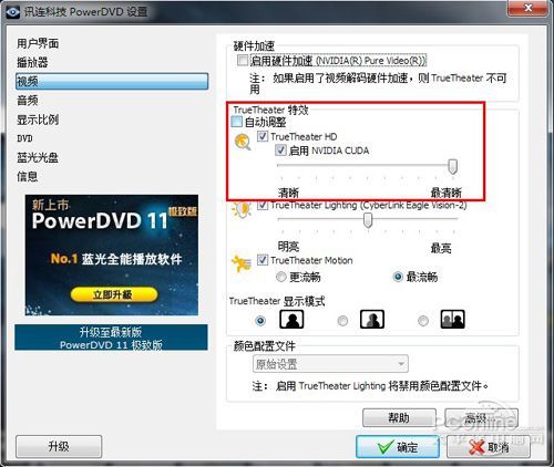 上图即为PowerDVD设置中的TrueTheater特效选项,我们可以自由开启和关闭TrueTheater HD,以及是否选择NVIDIA CUDA技术的支持,如果不勾选的话,软件将会以CPU软解方式进行倍线。