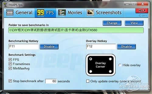 2、对于没有内置Benchmark工具的游戏,为保证科学性,使用Fraps软件,记录1分钟的帧数,最后得出最低帧/最高帧/平均帧;