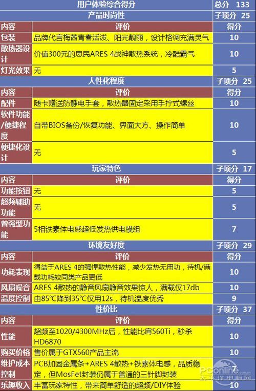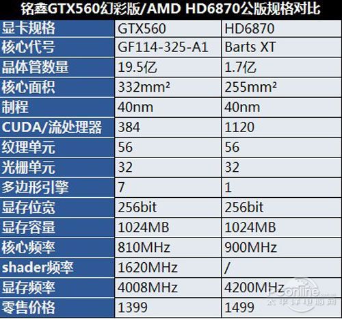 1、加入同价位竞争产品——AMD HD6870进行性能对比。通过规格对比列表,我们知道HD6870的优势主要体现在核心/显存频率上,并且,它的核心面积更小,发热量和待机功耗具有先天的优势,那么,铭鑫GTX560N幻彩价值300元的思民ARES 4散热,能否在一定程度上弥补GF114核心先天“臃肿”的缺陷呢?