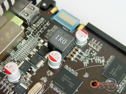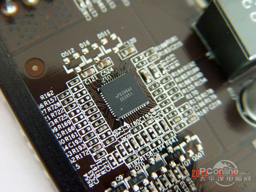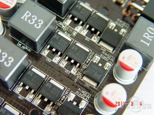 供电方面,显卡配备了4+1相核心显存分离式供电,显存供电在PCB左上部,每项供电辅以氧铁素体电感,以及来自日科能高的FP固态电容,不过MosFet只是普通封转的三脚场效应管,而非最新的SO-8封装八爪鱼,对加压高频的热稳定性会有影响。