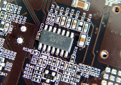 显卡背部的IC驱动,型号为iP6162DC,负责接收从PWM控制芯片传来的控制信号,控制场效应管开关供电。