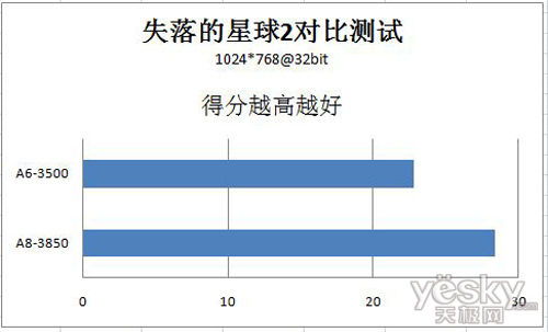 采用DX11特效的游戏对电脑系统有更高的要求,A8-3850和A6-3500都没有达到30帧的流畅运行标准。A8-3850仅超出A6-3500 6帧,可以说两者独显核心在游戏上并没有明显差距。