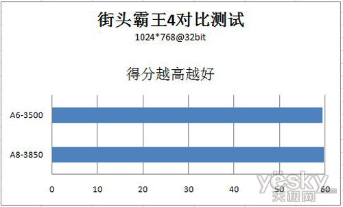 在街头霸王4测试中,A8-3850与A6-3500竟然分别跑出了59.71和59.52的帧数。让我们感到十分意外,两者的成绩竟然只相差0.1帧。