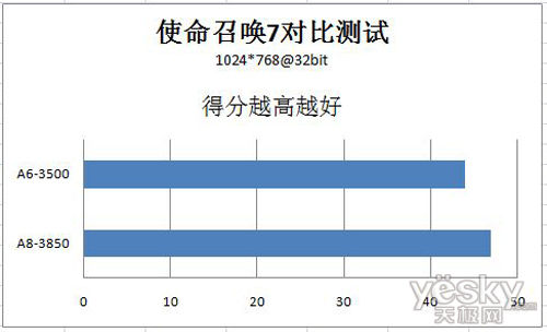 A8-3850在使命召唤7中帧数为47帧,A6-3500则跑出了44帧。两者差距仅为3帧,并不影响游戏流畅度。