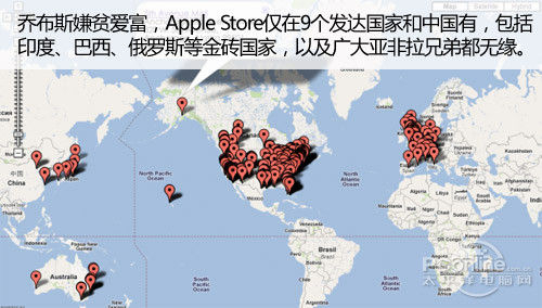 Apple是嫌贫爱富的典型。截止9月底,苹果将拥有363家苹果零售店,全部集中在北美、欧洲、日本、澳大利亚等9个工业化发达国家,当然我神圣天朝是个例外。