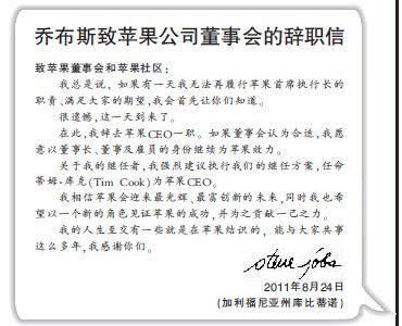 美国当地时间8月24日晚间,硅谷传奇人物史蒂夫·乔布斯(Steve Jobs)致信苹果公司董事会,如是宣布辞去首席执行长(CEO)职务 的决定。在题为《致苹果董事会和苹果用户》的信件中,现年56岁的乔布斯“强烈建议”苹果董事会执行“继任方案”,任命首席营运长蒂姆·库克 (Tim Cook)为苹果CEO。