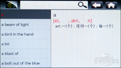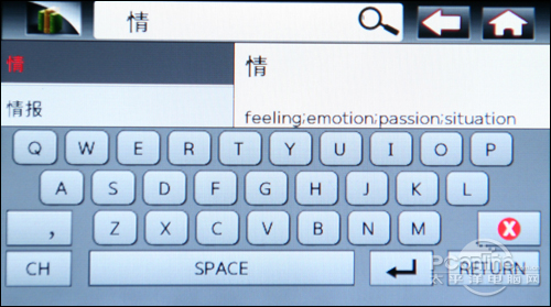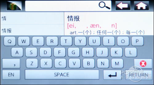 字典的应用也是相当容易入手的,用户只需要在最上方空白处点击一下,可欧X300会自动弹出键盘,接下来用户便可以输入要查找的文字了。可欧X300还巧妙地把英汉字典和成语词典结合在了一起,留意左下角,轻轻点击便会在“EN”和“CH”之间来回循环,十分方便使用的功能设计。