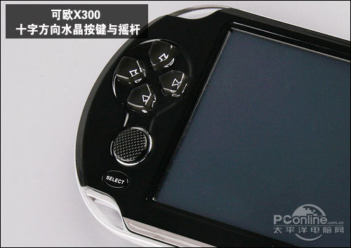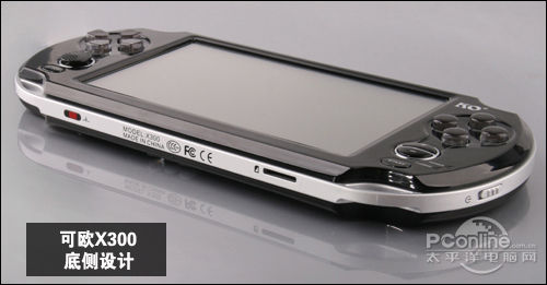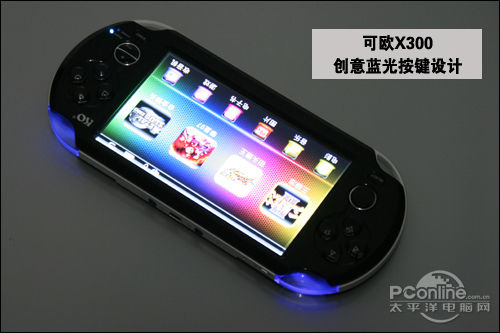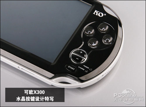 可欧X300的机身设计更讲究细节了,除了游戏按键参考沿用PSP的手柄式外,一般被设计掌上游戏机内外两边的菜单键、开始键、音量键等,均采用水晶按键并精妙地设置在X300的正面右侧,手感清爽舒适,适合长期使用。