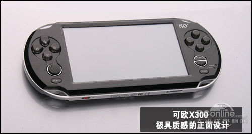 可欧X300整体外型设计参考了PSP的经典手柄式造型,并稍微加大,而外壳拿在手里的感觉却依然能保持舒适自然的质感,也正是基于此点,让X300充满大气与典雅。另外,可欧X300正面搭载了5英寸16万色的TFT触摸显示屏,分辨率为480×272像素,虽然与主流的800×480分辨率略有差距,但其实肉眼所见的差别并不会太大,并不影响娱乐的效果。